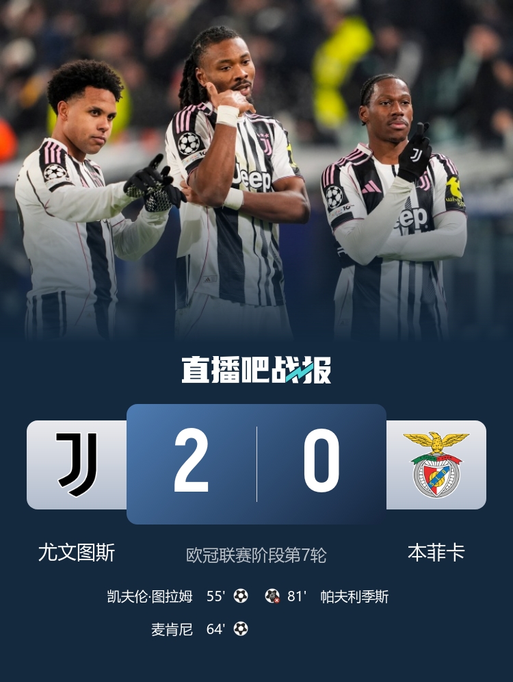 欧冠联赛阶段第7轮,尤文图斯2-0本菲卡,图拉姆、麦肯尼进球。